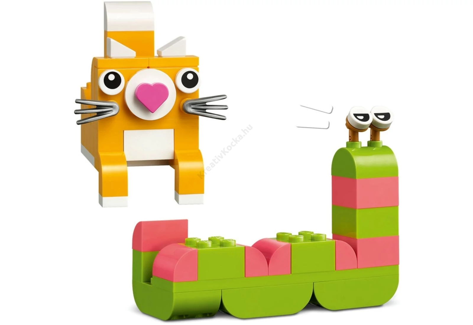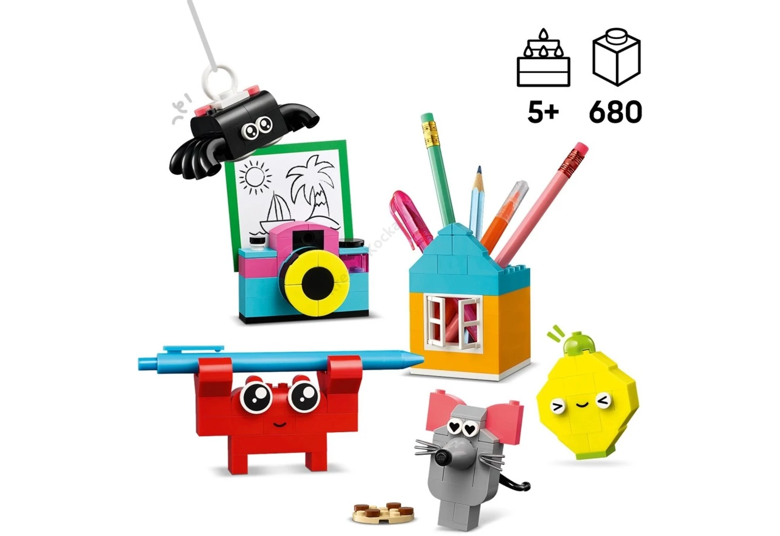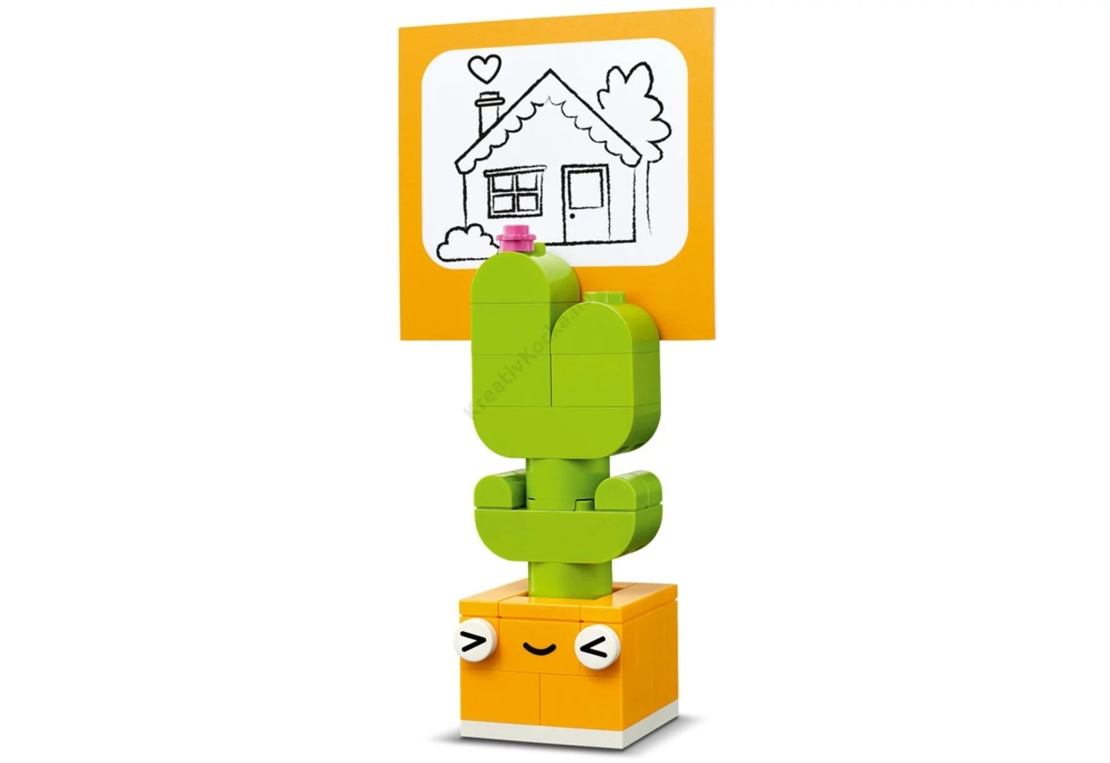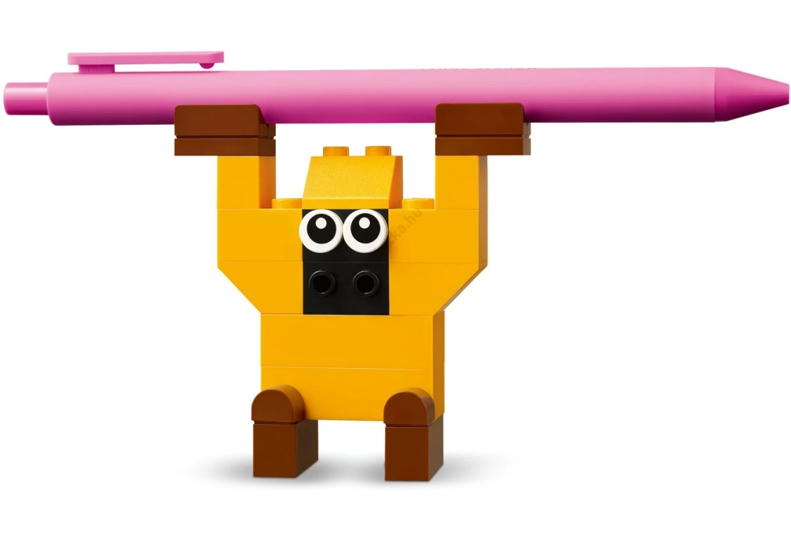 Kreatív vidámságdoboz! Legyen a LEGO Classic Kreatív vidámságdoboz (11042) remek kezdet egy ifjú építő számára! A 680 színes kockával, speciális elemmel és az inspiráló útmutatóval a vidám építés sosem ér véget. A kreatív vidámságdobozban építési javaslatokat találsz 10 gyorsan megépíthető modellhez, amelyek mindegyike a felhőtlen vidámságot idézi. A gyerekek ezeket a modelleket 12 másik játékká építhetik át, majd addig szabhatják őket testre, amíg végtelen sok egyedi alkotást nem készítenek, hogy olyan vidám és hasznos tárgyakkal díszíthessék a szobájukat, amelyeket ők maguk készítettek. A pók-, méhecske- és madárjátékokat akasztóelem segítségével lehet kiállítani. A rák-, majom- és házikómodellek apró tárgyak, mint például egy toll vagy egy fogkefe, tárolására alkalmasak. A virág-, fényképező-, kiemelő-, szív- és kaktuszmodell csíptetős elemmel van felszerelve, így a gyerekek jegyzeteket, kártyákat vagy képeket rögzíthetnek hozzájuk (a készletben színes papírt is találsz). Olyan modellek is várnak még rájuk, mint egy macska, egy egér, egy citrom, egy kukac vagy egy mosolygós arc. Szerezz örömet ezzel a vidám és praktikus szettel, és inspiráld a gyerekek kreativitását.